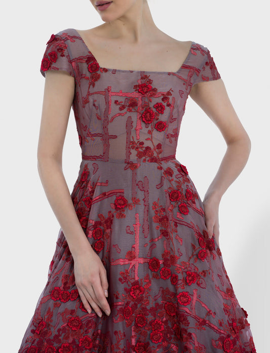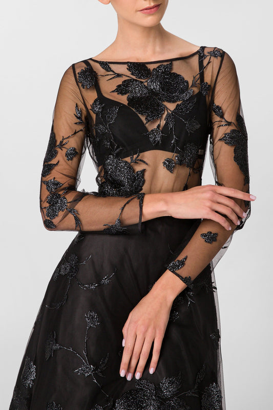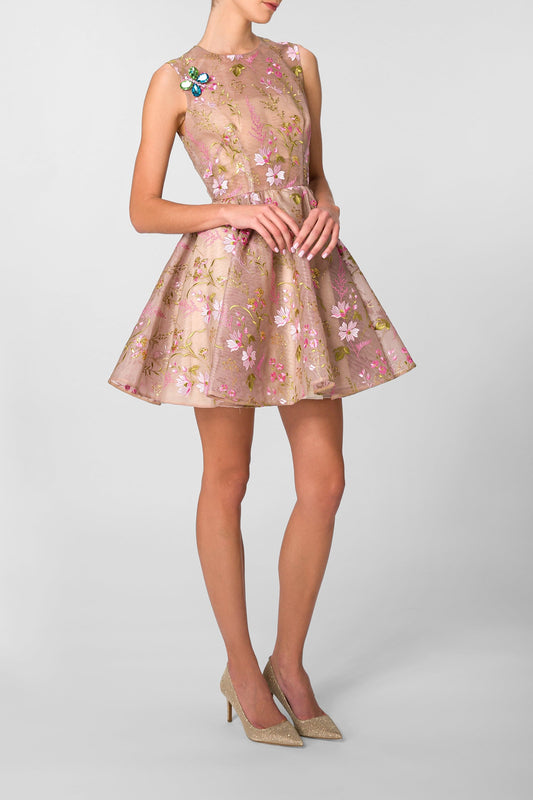 But it's the blooming floral tulle skirt that steals the show, with its multiple layers of soft flocked white tulle and pops of pastel embroidered satin stitch flowers in pastel pink, beige, yellow, and white. The visual delight is perfect for the spring season, and you can't help but twirl around to see the flowers dance with you.
